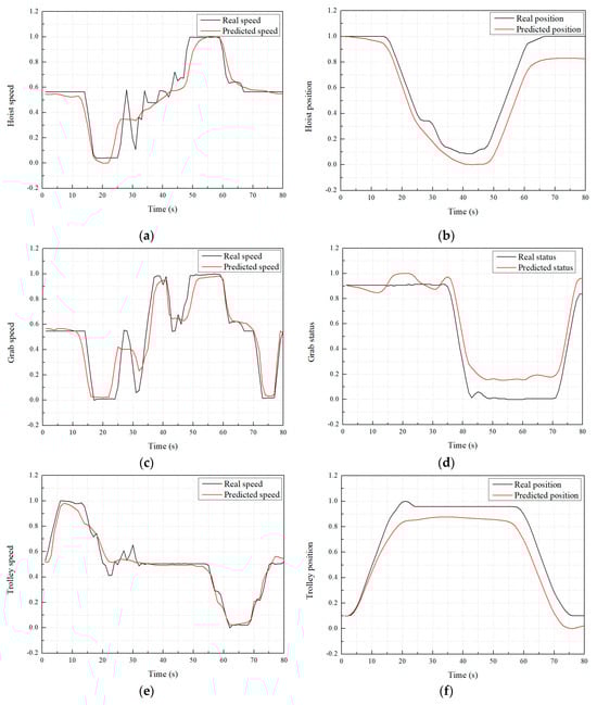 Comparison results of the position and speed data: (a) hoist speed; (b) hoist position; (c) grab speed; (d) grab status; (e) trolley speed; and (f) trolley position.