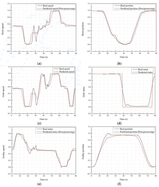 Post-processing results of the position and speed data: (a) hoist speed; (b) hoist position; (c) grab speed; (d) grab status; (e) trolley speed; and (f) trolley position.