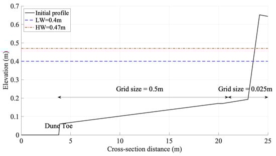 We set the wave parameters to reflect the conditions in the reference study, with a significant wave height (Hs) of 0.16 m and a mean absolute wave period (Tm01) of 2.3 s. The model incorporated two still water levels, 0.40 m for the Low-water test (LW) and 0.47 m for the High-water test (HW), simulating different tidal conditions. This dual setup allowed us to simulate two scenarios: LWSB (Low-water) and HWSB (High-water), providing insights into dune erosion under varying hydrodynamic stresses. LWSB and HWSB simulated results in the collision regime and inundation regime, respectively. We refined some parameters in our simulations. The parameters are listed in Table 2 including the comparisons with the referred paper. The one-dimensional model’s mesh, covering a 25 m cross-section, was configured for computational efficiency. From 3.8 m to 4.3 m, a 0.1 m grid was used; from 4.3 m to 20.4 m, a 0.5 m grid; and from 20.4 m to 25 m, a finer 0.025 m grid (Shown in Figure 1). All simulations share these parameter values, signifying a standardized approach.