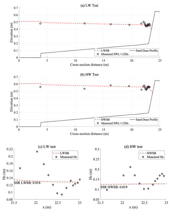 In the hydrodynamic validation, the dune face was designated as a non-erodible layer. Figure 2 illustrates the cross-shore profiles of still water level (SWL) and observed significant wave height under low water (LW) and high water (HW) conditions, capturing the collision and overwash regimes, respectively. In Figure 2, LWSB and HWSB are simulated results by red dash lines. The sum of square residuals (SSR) is used to quantify the model performance, as shown in Figure 2c,d. The significant wave height (Hs) predictions from the XBSB model closely match the observed data, indicating the model’s superior capability to simulate the complexities of wave interaction with a static dune structure.