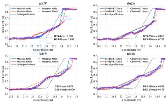 Building on the hydrodynamic validation, we assessed the morphological responses of the dune profile under various water levels. The morphological evolution of the dune profile was analyzed using simulations for low (LW) and high water (HW) tests, replicating dune responses over 510 min for LW and 270 min for HW. The model performance was evaluated using the Brier Skill Score (BSS) [], which was applied as a quantitative measure of the model’s accuracy in simulating the morphological evolution of the dune profile. A BSS of 1 indicates high accuracy, while a BSS ≤ 0 indicates poor predictive capability. Scores below 0.3 are considered bad, 0.3–0.6 are fair, 0.6–0.8 are good, and above 0.8 are excellent. The BSS is calculated using Equation (7).