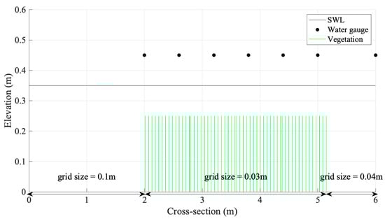 The entire experimental section was six meters long with a flat and fixed bottom. The first two meters of the area had no vegetation and was mainly used for stabilizing and calibrating wave conditions. This was followed by a 3.16 m vegetated area. The final 0.84 m also had no vegetation. The vegetation had a stem height of 0.25 m, a diameter of 0.0043 m, and a density of 1012 units/m2. These vegetation parameters were consistent with the laboratory experiment. The drag coefficient was adjusted based on the results of the simulated wave heights. In the first scenario, the initial significant wave height was 0.08 m with a wave period of 1.4 s and the initial water level was 0.35 m. In the second scenario, the initial significant wave height remained the same at 0.08 m with a wave period also at 1.4 s, but the initial water level was increased to 0.4 m. The third scenario introduced changes in significant wave height, wave period, and initial water level. The grid spacing varied from 0.1 m to 0.03 m, with a total of 153 grid points. In the model, the vegetation zone spanned from 2 m to 5.16 m, consisting of 112 grid points, with vegetation present on 56 of those points. The total runtime of the model was 3000 s, and data were output every 0.35 s or 0.4 s. The sketch of the XBeach model and vegetation field is shown in Figure 4.