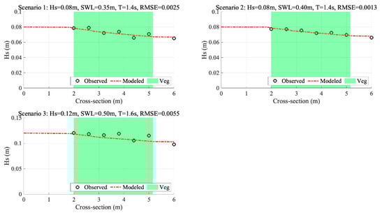 The modeled significant wave heights were in good agreement with the observed data in Figure 5, demonstrating that the XBSB model replicated the conditions of the physical flume well. Observations from Figure 5 clearly show that vegetation has a notable attenuation effect on waves across all three scenarios. In the first scenario, the wave height decreased by 0.013 m, in the second scenario it decreased by 0.011 m, and in the third scenario, the reduction was more significant, amounting to 0.022 m. Comparing scenarios 1 and 2, it is evident that an increase in water level leads to a decrease in the alongshore fluctuation of measured wave heights, with the percentage of wave height attenuation dropping from 16.8% to 14.1%. The third scenario shows the most significant wave height attenuation, reaching 18.5%. Meanwhile, given the low RMSE values (Table 3) and the close match between the observed and modeled data points, especially within the region where vegetation is present (the green window), the conclusion is that the calibrated by the XBSB model can accurately reflect the wave attenuation characteristics of the vegetation in the flume, making it suitable for simulating the propagation process of waves in vegetated areas.