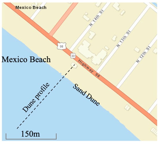 Building upon the foundation laid out in Section 2 and Section 3, we evaluated the capability of the XBSB model to simulate and forecast the interactions between waves, sand dunes, and vegetation. The good model performance in these sections provides a basis for the following application. In this section, we have applied the XBSB model to a one-dimensional dune setup located at Mexico Beach, Florida, USA (Figure 6), aiming to examine the wave attenuation and dune erosion under extreme storm conditions with different vegetation cover.