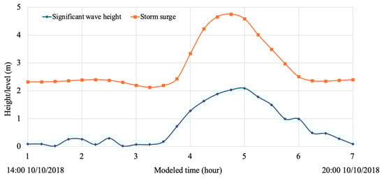 The bed elevation of dune profile data was sourced from NOAA LiDAR Database website [], which offers pre- and post-hurricane LiDAR data. This dataset enables detailed analysis of geomorphic changes in response to Hurricane Michael. In our previous study, we have already validated a two-dimensional XBSB model on Mexico Beach, demonstrating strong performance []. Therefore, we used the best-performing parameters from that study in the present model and applied the same boundary conditions, including significant wave height and storm surge data (Figure 7). Unlike the previous large-scale study, which represented vegetation as bottom friction using Manning’s coefficient, this one-dimensional model features detailed vegetation parameters and higher grid resolution in vegetated areas. This approach provides a more accurate simulation of wave-vegetation interactions and wave behavior near dunes. Detailed model settings are provided below.