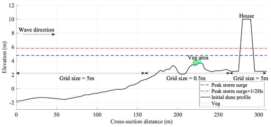 As can be seen in Figure 10 and Figure 11, compared with the observed post-hurricane dune elevation, vegetation on dunes reduced dune erosion and enhanced coastal resilience. This conclusion aligns with the findings of some recent studies [,] that demonstrated that vegetation significantly reduces wave heights, thus lowering flooding and erosion risks and providing multiple ecosystem benefits. However, because the XBSB is based on some modeling simplifications, the actual applications of vegetating the sand dune warrants further exploration. One notable simplification in the XBSB model is the representation of vegetation as uniformly distributed, slender, cylindrical structures. In reality, the vegetation does not grow uniformly across the dune surface and has leaves that contribute to the complexity of their density distribution. For example, Suzuki et al. [] pointed out that drag force induced by horizontal vegetation stems/roots and porosity are often neglected in numerical models. A more accurate method might be to set up horizontal vegetation fields with various densities in future studies.