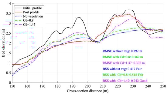 We used the empirical formulations of conducted by Garzon et al. [] and Yin et al. [] to calibrate the XBSB model. The full formulas are listed in Table 1. The resulting values were 1.47 and 0.8. Besides, based on Section 4.1, we compared the modeled dune elevations with the observed post-hurricane LiDAR data in Figure 10. Figure 10 illustrates the evolution of dune profiles under varying drag coefficients during Hurricane Michael. The figure presented five distinct profiles: the observed initial pre-hurricane profile, the observed post-hurricane profile, a modeled profile without vegetation, and two modeled profiles with vegetation of different values. The observed post-hurricane profile showed marked changes, indicating significant morphological activity caused by the hurricane. To validate the performance of the model, we calculated the Brier Skill Scores (BSS) for three cases. Among them, the case with vegetation and a drag coefficient of 1.47 yielded a BSS of 0.742, which is greater than 0.6. According to the BSS classification in Section 3.1, this indicates that the model performance is good. In contrast, the case with a of 0.8 resulted in a BSS of 0.518, indicating fair model performance. This also indicates that, in this specific field application, Garzon’s formula for the drag coefficient was more suitable than Yin’s formula. Therefore, we used the model with a of 1.47 for the sensitivity analysis in Section 4.3. Additionally, the modeled profile without vegetation demonstrates the most pronounced departure from the observed initial conditions. This profile exhibited the highest average deviation with an RMSE of 0.392 m and experienced the most substantial erosion at a depth of 1.105 m. This highlights the erosion vulnerability of dune beds in the absence of vegetation and underscores the stabilizing role that vegetation plays in dune ecosystems.