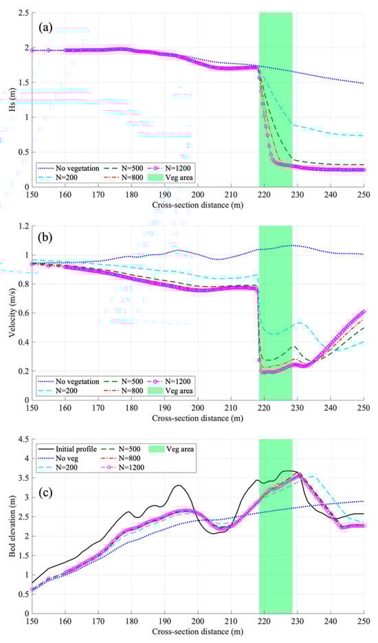 In this section, we conducted a sensitivity analysis on the impact of vegetation density on dune erosion and wave attenuation under regular wave conditions. Based on the predicted results from the XBSB models in Section 4.2, we examined various vegetation cover scenarios. The various vegetation densities of study cases are listed in Table 5. The input tide boundary condition was the peak storm surge of 4.76 m. The input wave condition was a significant wave height of 1.98 m during Hurricane Michael, as shown in Figure 7. The model ran for 3 h, simulating the evolution of the dune, the changes in flow velocities, and the changes in significant wave heights under different vegetation densities. The baseline parameters for the XBSB model remain consistent with those in Section 4.2, featuring a vegetation height of 0.7 m and a stem diameter of 0.005 m. This comprehensive suite of cases allows for an in-depth analysis of the interaction between vegetation and wave dynamics, highlighting the potential of vegetation in mitigating coastal erosion and enhancing dune protection under storm surge conditions.