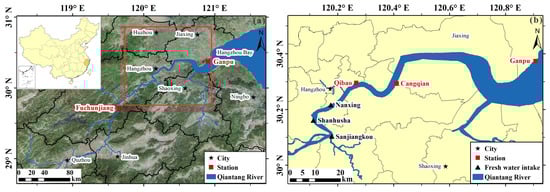 The Qiantang River is the largest river in Zhejiang Province, China. The Qiantang Estuary extends from the Fuchunjiang power station to the mouth of Hangzhou Bay and exhibits a funnel-shaped plane. The location of the study area is shown in Figure 1a. The average annual runoff upstream is 318.8 × 108 m3, but the average tidal range is 5.62 m, and the maximum tidal range can reach 9 m at Ganpu. Strong tidal force and relatively weak upstream runoff make the study area a world-famous macrotidal estuary but also cause more severe saltwater intrusion problems than other estuaries.