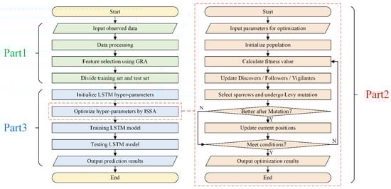 Overall framework and flowchart of the ISSA-LSTM model. Part 1 is data preprocessing and feature selection; Part 2 is hyperparameters optimization by ISSA; Part 3 is the LSTM model.