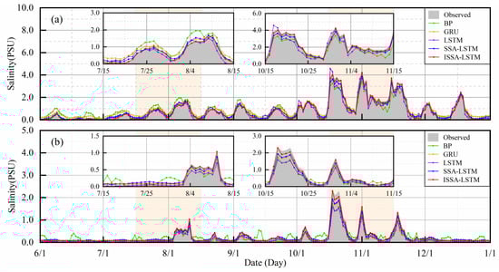Prediction results of different models. (a) CQ station. (b) QB station. The gray color block represents observed values of daily maximum salinity. The green, brown, purple, blue, and red lines represent the predicated results of BP, GRU, LSTM, SSA-LSTM, and ISSA-LSTM models. The light orange region is zoomed in and shown in the small window in the subgraph (7/15–8/15, 10/15–11/15).