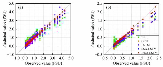 Moreover, as shown in Figure 4, the curves of the salinity prediction results of the GRU, SSA-LSTM, and ISSA-LSTM models exhibit a generally good fit with the observed values, while the BP model results show significant fluctuations compared to the observed values. In the salinity peak region, the ISSA-LSTM model provides the closest prediction to the peak values, SSA-LSTM predicts slightly lower peak values and the unoptimized LSTM model exhibits a considerable deviation in peak results. It suggests that the LSTM model optimized by ISSA performs better in the salinity peak prediction. The scatter plots shown in Figure 5 also confirm these conclusions.