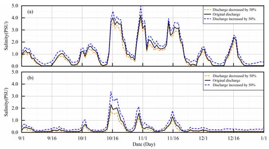 With the other factors remaining constant, the salinity predictions for the CQ and QB stations were conducted under three different flow conditions: original discharge, discharge increased by 50%, and discharge decreased by 50%. The results are shown in Figure 6.