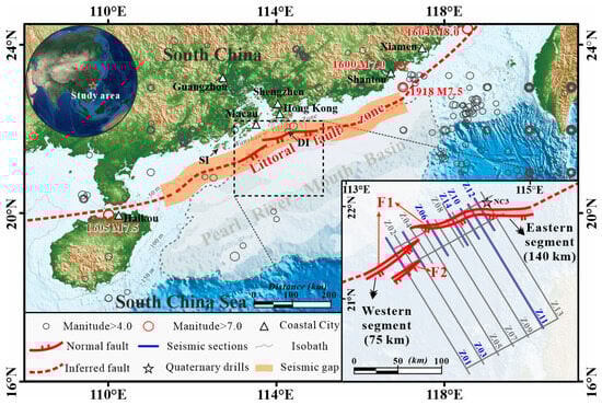 Dai, X.; Li, Z.; Hu, L.; Zhang, P.; Yang, X.; Almeida, R.; Li, G. Exploring Fault Geometry and Holocene Deformation of the Littoral Fault Zone within the Seismic Gap South of Greater Bay Area, China. J. Mar. Sci. Eng. 2024, 12, 1350. https://doi.org/10.3390/jmse12081350