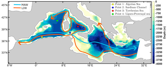 Schematic representation of the model domain with its bathymetry and typical routes of Atlantic Modified Water (MAW) and Levantine Intermediate Water (LIW). The four colored dots indicate the locations where multidecadal trends simulated by the nonlinear multilayer model have been calculated.