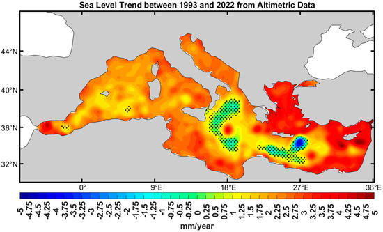 SSH trends in the Mediterranean Sea as calculated using the available altimetric data for the period 1993–2022. Dotted areas mark regions where the obtained trends are found to be statistically insignificant at the 95% confidence interval. Note that a similar map, referring to the period 1993–2019, was presented by Meli et al. (2023) [24].