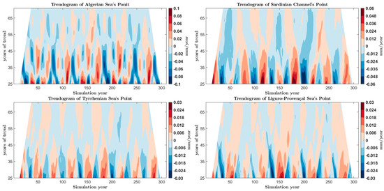 Trendograms for sea level height in four selected points of the western basin (see Figure 1 for the location of these points) as simulated by the numerical model are depicted in Figure 3. The points were selected simply to illustrate the variability obtained in the simulated trends in regions strongly influenced by the flow of the water masses deriving from the Atlantic inflow and the Levantine outflow on time scales largely exceeding the duration of available altimetric observations (30 years). They are representative of areas of the western basin where strong interactions between MAW and LIW take place (see also Supplementary Materials). Clear trends in the multi-decadal time scales emerge that reflect the propagation of very low-frequency oscillations throughout the basin produced as a part of the oceanic intrinsic variability due to the steady inflow/outflow of AW/LIW throughout the strait of Gibraltar [23]. Hence, steadily induced oceanic intrinsic variability is able to generate long-lasting trends of periods comparable with the periods of available altimetric observations and even much longer (see also our Supplementary Materials), exhibiting, on shorter temporal scales, magnitudes comparable with the observed ones. Their spatial variability is large: it is the result of the variability induced by the underlying bathymetric features and by the different thickness of the local water layers in the very slow fluctuations remotely triggered by the boundary flows [23]. We note that the signal amplitude, visible as trend intensities and as trend durations, decreases from the region of the Algerian Current toward the Tyrrhenian Sea and the Balearic Island. This fact reflects the particular attenuation of the propagation of a very low-frequency signal following a cyclonic route consistent with the path of the MAW in the eastern part of the western Mediterranean subbasin [27] in a very simplified, process-oriented simulation as the one performed here. The assumption of steady boundary conditions helps us elucidate the complex periodicities that spontaneously emerge. Adding periodic forcing to the steady boundary conditions would likely introduce additional fluctuations, reflecting the imposed harmonics, which would then appear in trendograms like the one depicted in Figure 3.