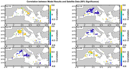 In the six examples selected here (the whole series of 270 correlation surfaces can be found in the Supplementary Materials), large areas of significant correlations emerge, the anticorrelation areas being in general broader than the positive correlation ones. As the model is forced by steady boundary conditions, a common signal between observed and simulated SSH can be in co-phase or anti-phase, depending on the selected 30-year simulated interval chosen to pair the altimetric time series, in the presence of an asymmetric simulated undular signal. All areas are substantially larger than the typical diameter characterizing mesoscale features encountered in the Mediterranean Sea [23], which indicates the spatial persistence of similarities between simulations and observations to largely exceed the typical extent of regions possibly characterized by large autocorrelation properties.