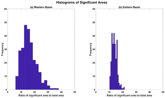 Fractional areas in the western (a) and eastern (b) sub-basins where statistically significant correlations between simulated and observed 30-year time series were obtained.