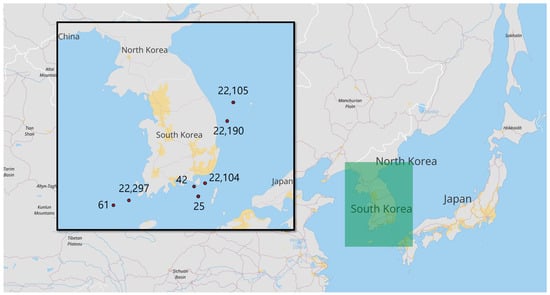 Locations of the 7 offshore wind stations around the Korean Peninsula.