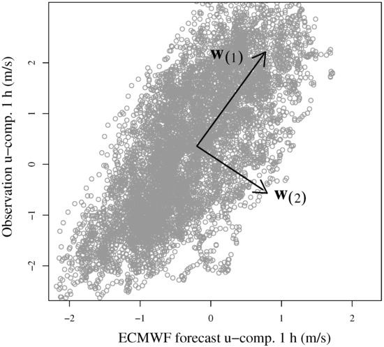 Illustration of PCA for two variables: ECMWF forecast u-comp. 1 and Observation u-comp. 1 .
