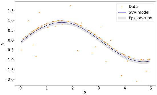 where and b are the parameters of the regression function, C is the regularization parameter, is the width of the epsilon tube, is the target values, and is the input variables. Figure 3 illustrates the support vector regression with the epsilon tube. The central solid line indicates the regression function, representing the best fit within the epsilon tube. The shaded area around this line is the epsilon tube. Points falling within this tube are considered well predicted. The epsilon tube defines a margin of tolerance, where no penalty is given to errors.