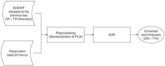 In our study, we employ SVR to correct the u- and v-components of wind data for each forecasting interval. The input features for SVR include both observed and forecasted wind data. As standard practice, we standardized the input variables [44] by rescaling them to have a mean of zero and a standard deviation of one, ensuring equal contribution from each variable. We then performed PCA to reduce dimensionality, capturing the most significant variance while minimizing noise and computational complexity before training the SVR models. Figure 4 shows a flowchart of the wind prediction correction process using PCA and SVR.