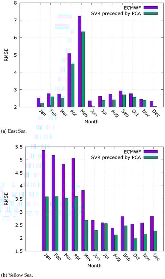 In the East Sea, the RMSE values for forecasts from the ECMWF range from 2.52 in January to 7.22 in May. After applying PCA and SVR, the RMSE values show a significant reduction, ranging from 2.23 in January to 6.33 in May. This demonstrates a consistent improvement across all months, with the post-processed RMSE values being lower than the original forecasts from the ECMWF.