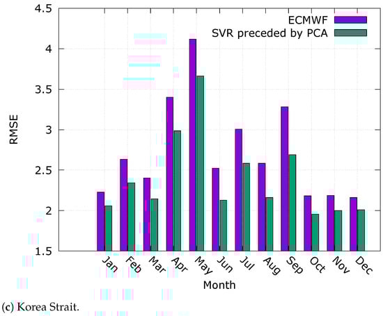 In the Korea Strait, ECMWF RMSE values range from 2.23 in January to 4.12 in May. After post-processing, the RMSE values improve to a range of 2.06 in January to 3.66 in May. The reduction in RMSE values across all months indicates the robustness of the PCA and SVR approach in providing more accurate wind forecasts for the Korea Strait.