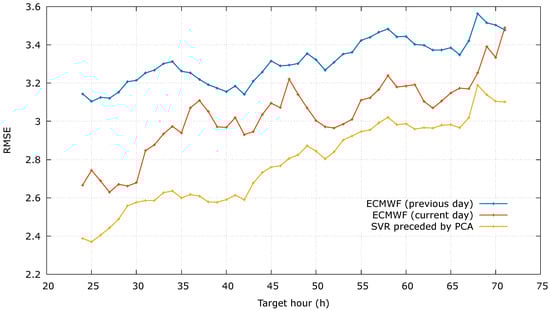 RMSE comparison of wind prediction. ECMWF (previous day) and its post-processed version with SVR cover the 24 –71 prediction period, while ECMWF (current day) covers the same time period with the 0 –48 forecast.