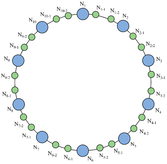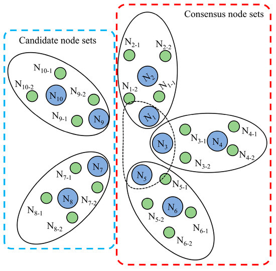 36]. Finally, nodes are grouped based on their positions on the hash ring. The blockchain network comprises N nodes in total, with the number of consensus nodes denoted as A and the number of candidate nodes as B, maintaining a ratio of A:B = 3:2. The nodes are divided into m groups, with m nodes randomly selected to serve as the initial leader for each group. Nodes within the candidate node set only update their local states upon reaching consensus and temporarily do not participate in the consensus process. Assuming that there are a total of 30 nodes in the blockchain network divided into five groups, the grouping process of nodes is presented in