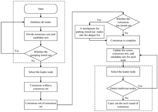 Figure 6. Initially, all marine fishery vessel nodes are initialized and grouped into consensus and candidate sets. During the consensus process, groups validate and achieve consensus on request from clients. If a group timeout occurs, the process is reinitialized; if not, each group randomly selects a leader node. The group first reaches consensus within the consensus set, and then the leader node participates in consensus outside of the consensus set. It checks whether the consensus processing times out; if the transaction of any node times out, it is added to a danger list. If no timeout occurs, the consensus processing concludes. After the consensus concludes, each node’s score and state are updated. Then, the system’s leader node is optimally selected to reduce the possibility of Byzantine nodes becoming leader nodes.