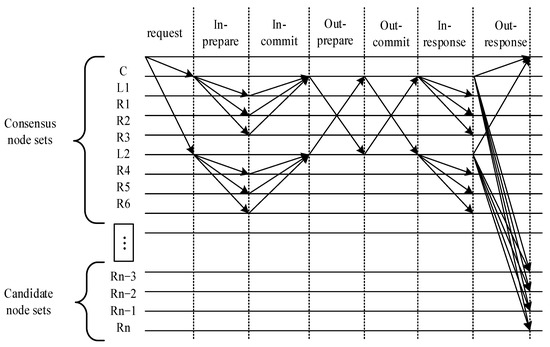 The NR-PBFT consensus algorithm includes the original PBFT’s prepare, commit, and reply phases and further divides the three stages into intra-group and out-group processes, as illustrated in