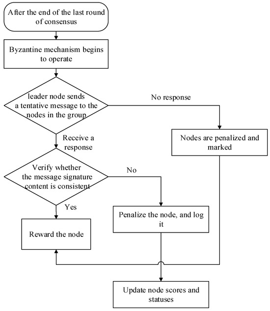 If the leader node receives a response from any node, it is necessary to verify the authenticity and consistency of the response. The process starts with the validation of the node’s signature to ensure that the message is indeed from that node and has not been altered. Subsequently, the content of the messages from different nodes is compared to check for consistency. Nodes that provide consistent responses are rewarded accordingly; if the leader node does not receive a response or receives a malicious message, appropriate penalties are applied. Following this, the scores and statuses of the nodes are updated.