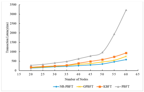 Figure 10 illustrates the variation in transaction latency for PBFT, KBFT, GPBFT, and the proposed NR-PBFT as the number of nodes in the network increases. The abscissa represents the total number of nodes in the network, while the ordinate represents the transaction latency.