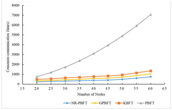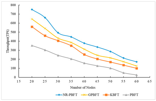 Figure 11 shows the trends in throughput changes for PBFT, KBFT, GPBFT, and NR-PBFT as the number of nodes increases. The abscissa represents the total number of nodes in the network, while the ordinate represents the throughput.
