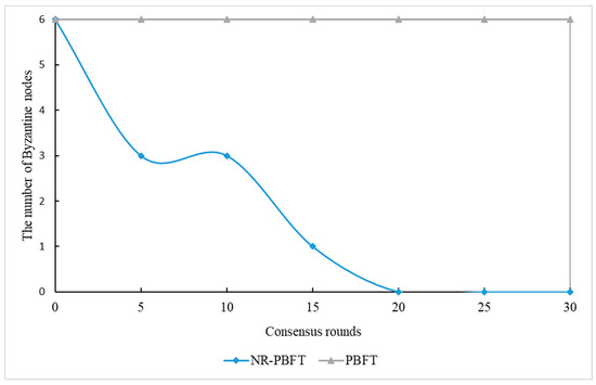 Due to the lack of a reputation evaluation model, the PBFT consensus algorithm fails to effectively penalize Byzantine nodes, allowing them to persist in the blockchain network and thus weakening the overall system security. To solve the problem, the NR-PBFT algorithm introduces a Byzantine node detection mechanism. Through this mechanism, once the system detects a malicious node, it immediately reduces the node’s reputation value to zero and removes it from the blockchain network. It reduces the possibility of Byzantine nodes becoming primary nodes, thereby enhancing the security of the blockchain network. The comparison of the number of Byzantine nodes in the PBFT and NR-PBFT consensus algorithms is shown in the following