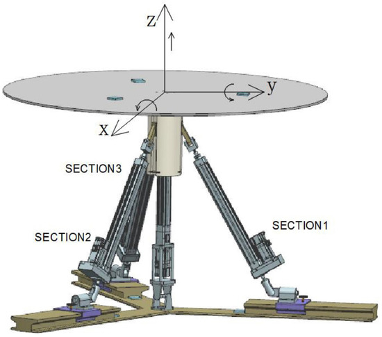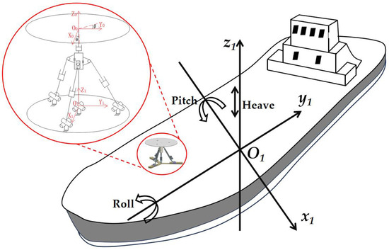 As shown in Figure 1, this platform can perform heave motion along the Z-axis and rotational motion around the X and Y axes. The heave motion along the Z-axis is achieved by the extension and retraction of the central electric cylinder. The rotational motions around the X and Y axes are achieved through the coordinated interactions of SECTION1, SECTION2, and SECTION3 along the respective axes. Figure 2 shows the working diagram of the compensation platform on a ship. This platform is placed at the ship’s center of gravity, establishing an external coordinate system at the ship’s center of gravity and an internal coordinate system at the center of the upper platform of the compensation platform. When the ship experiences roll, pitch, and heave motions, the structure compensates in three directions, ensuring that the upper platform of the compensation platform remains relatively stationary.