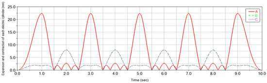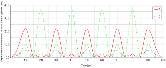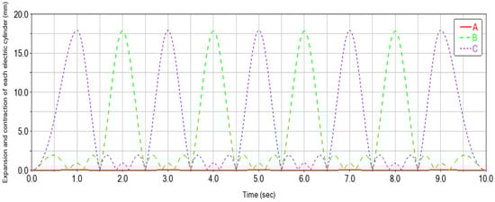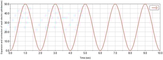 After adding the kinematic pairs at each connection point, we proceed to verify the motion around the X-axis, Y-axis, and along the Z-axis. The rotational motions around the X-axis and Y-axis are achieved through the coordinated interactions of SECTION1, SECTION2, and SECTION3. The simulations include single-degree-of-freedom motion compensation of 20 degrees around the X-axis, single-degree-of-freedom motion compensation of 20 degrees around the Y-axis, coupled motion compensation of 20 degrees around both the X-axis and Y-axis, and single-degree-of-freedom motion compensation of 50 mm along the Z-axis. The simulations provide the extension and retraction curves of electric cylinders A, B, C, and D for SECTION1, SECTION2, and SECTION3 in different scenarios. These characteristics are shown in Figure 6, Figure 7, Figure 8 and Figure 9, respectively.