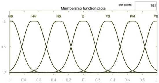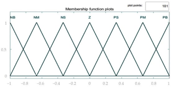Fuzzy processing is a process that first normalizes the input quantity according to the membership function of the fuzzy set, then discretizes the normalized input quantity, and finally converts it into the corresponding variable value on the domain and determines its membership. The fuzzy rules adopt the standardized design created by Mamdani, define the range of inputs and and outputs , , and as the domain [−1, 1] on the fuzzy set, and select the seven-level fuzzy subset , where N represents negative, P represents positive, B represents large, M represents medium, S represents small, and Z represents 0. The input membership function adopts Gaussian membership function, and the output membership function adopts triangular membership function. The membership function of input quantity is shown in Figure 12, and the membership function of output quantity is shown in Figure 13.