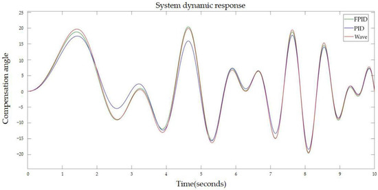From Figure 15, it can be observed that as the compensating platform experiences continuous wave fluctuations, the required compensation angles vary over time. In such scenarios, traditional PID control systems often exhibit delayed responses, leading to increased compensation errors. In contrast, fuzzy PID control demonstrates faster response speeds and superior compensation performance compared to standard PID control. Specifically, fuzzy PID control minimizes impacts during the compensation process, resulting in smoother wave responses and greater adaptability. See also Figure 16.