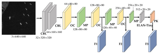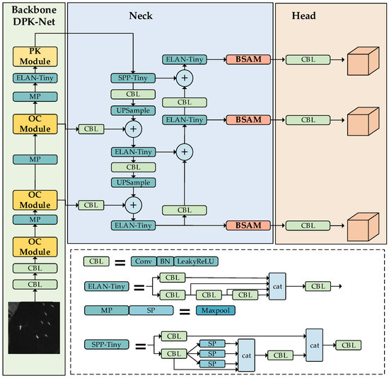 In this section, we will introduce DPK-Net in detail. The specific structure is shown in Figure 2. Within the DPK-Net architecture, the input image undergoes initial sampling via two CBL modules, reducing its size to one-fourth of the original dimensions. Subsequently, the network integrates three optimized convolutional modules, three MP modules, one ELAN-Tiny module, and one deep poly kernel module on top of the baseline model YOLOv7-tiny. This arrangement produces three distinct feature maps, each on a different scale.