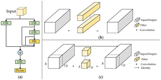 Figure 3a illustrates the OC module’s architecture, which features two distinct branches. The left branch enhances the network’s receptive field by passing through the CBL module. Meanwhile, the right branch sequentially processes through the CBL and PBL modules, enabling comprehensive feature extraction with a lightweight design and minimizing the parameter count, which is typically increased by standard convolutional module stacking. Ultimately, the output feature maps from both branches are concatenated, followed by dimensionality reduction to decrease the channel count for the final output. Incorporating PConv into this module enhances network efficiency and spatial feature extraction while maintaining a lightweight structure. As depicted in Figure 3c, PConv optimizes this process by selectively applying filters to some input channels, leaving the others unchanged [32]. For continuous or periodic memory access, the initial or final consecutive channel is computed to represent the entire feature map.