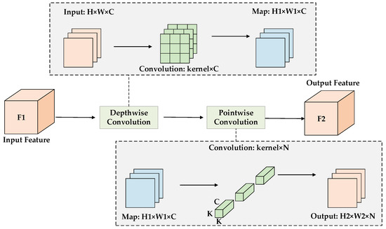 Depthwise separable convolution is composed of two stages, as illustrated in Figure 4. First, depthwise convolution is applied to the input features. In this step, each convolution kernel is linked to a specific channel, meaning that each channel undergoes a convolution operation using only its corresponding kernel. The output feature map retains the same number of channels and convolution kernels as the input feature map. Subsequently, the feature maps are processed using pointwise convolution. This involves weighting and combining the feature maps from the previous step along the channel dimension, resulting in new feature maps in which the number of convolution kernels matches the number of output channels [33].