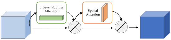 Given an intermediate feature map as input, the BiLevel Routing Attention module is utilized to generate an attention map , and the Spatial Attention Module is utilized to generate a 2D spatial attention map and the overall attention process can be summarized as,