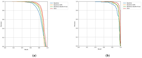 PR curves for ablation experiments: (a) is based on HRSID, and (b) is based on SSDD.