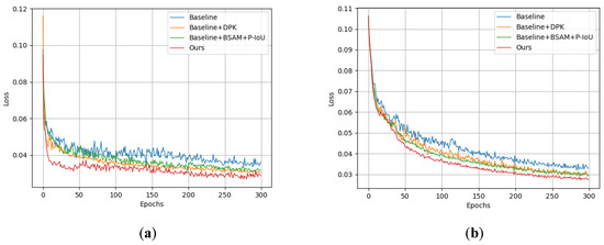 The loss curves of the proposed YOLO-MSD and the original YOLOv7-tiny model: (a) is based on HRSID, and (b) is based on SSDD.
