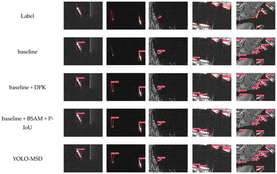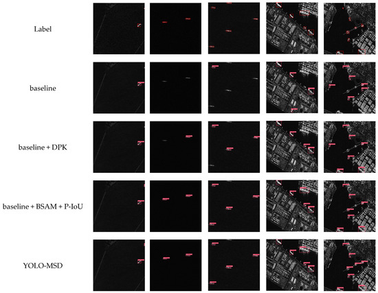 The results shown in Table 4 indicate that Experiments 1–8 use different combinations of modules. Experiment 1 builds the baseline model of the HRSID dataset, and it can be seen that the mAP50 of the baseline model is 84.3%. Experiment 2 builds the OC module in the backbone network, where the number of parameters and computation is reduced due to the introduction of PConv. However, all the metrics are improved over the baseline model. In Experiment 3, after adding the PK module to the backbone network only, all the indexes are significantly improved compared with the baseline model, and the highest value of 62.9% is reached at , which indicates that the PK module is more effective for large object detection. In Experiment 4, adding only the BSAM attention mechanism only slightly decreases, and all other metrics are improved over the baseline model. In Experiment 5, only the P-IoU loss function is added, only slightly decreases, and all other indicators are improved over the baseline model. In Experiment 6, based on Experiment 2, the PK module is added to form the DPK-Net. All the indexes are improved, but compared with Experiment 3, there is a slight decrease in . All the other indexes are improved, which indicates that the combination of the PK module and the OC module is good for detecting large targets, and it can have a balanced effect on detecting targets at different scales. Experiment 7 adds the P-IoU loss function based on Experiment 4, and all the indexes are improved. All the indexes are improved compared with Experiment 5, especially the effect on is more significant, which indicates that the combination of BSAM and P-IoU is more effective for detecting small targets. All blocks were used in Experiment 8, and the indicators achieved a well-balanced effect. The mAP increased from 84.3% to 90.2% compared to the baseline model, indicating a substantial improvement in the detection accuracy of ship targets across various scales, but and decrease by 0.1% and 0.7%, respectively, compared with Experiment 6. In addition, the multiscale performance analysis of SSDD-based ships is shown in the Supplementary Material, Table S1.