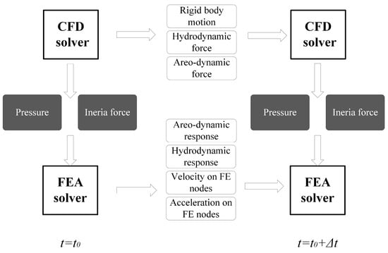 In this paper, a coupled CFD-FEA method based on the CFD solver and the nonlinear FEM solver is employed (see Figure 1). As mentioned above, the CFD platform STAR-CCM+ is used for the aerodynamic and hydrodynamic solution around the floating wind turbine, and ABAQUS is used for the structural simulation of the floating wind turbine. The coupling process is introduced as follows. First, both the fluid pressure and the inertia force are interpolated by the least squared method in the CFD platform. Second, the nodal loads in the structural model are obtained from the CFD model by using a surface integral that calculates the aerodynamic and hydrodynamic force and the inertia force. The data exchange at the fluid–structure interface is realized by the mapping approach. The mapping of wave load and the transmission of structural deformation are achieved between the hydrodynamic model and the structural one. Finally, the structural deformation information is transferred from the FEM solver to the CFD solver, the element types are identified by the CFD solver in the structured mesh, and the interpolation is applied by using the shape function method.