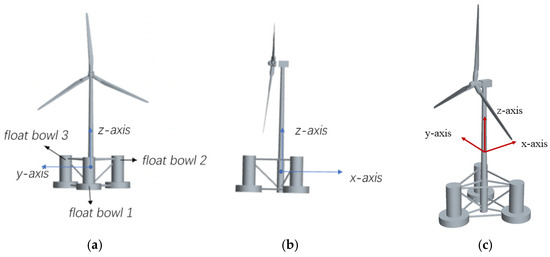 The floating wind turbine. (a) The front view; (b) the side view; (c) the oblique view.